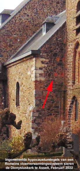 In het muren van het kerkje zijn links en rechts van de kerktoren voor de sier ronde hypocaustumtegels van een vloerverwarmingssysteem