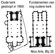 Hiernaast zie je hoe de twee kerken ten opzichte van elkaar stonden, de oude kerk steekt met het koor als het