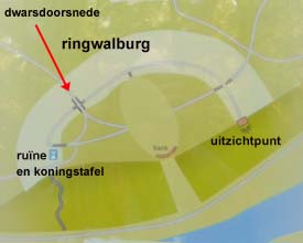 naar boven waaronder een vuurstenen mes. Deze vondsten deed men onder de huidige ringwal, die uit de negende eeuw tot tiende eeuw van onze jaartelling stamt.