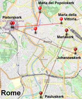 Tevens zien we in Utrecht dat de Pieterskerk de top van het kruis is, in Rome is dat de Mariakerk. Dat deze kerken in Utrecht en Rome een kruis lijken te vormen lijkt me dus geen vooropgezet plan.